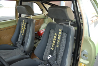 Das Gestell besteht aus Originalkonsolen der Seriensitze. Ich habe die Seriensitzebefestigung entsprechend abgetrennt und Winkel aufgeschweisst. Inkl Verstärkungsbleche. Muss eingetragen werden, ist aber normalerweise kein Problem, da bei älteren Autos die Konsolen auch Eigenbau sein dürfen. Die Schweissnähte sind ordentlich ausgeführt (bin Schlosser).