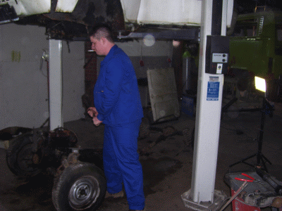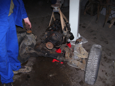 Habe alles erledigt was von unten gemacht werden muß, also Achsen und Antrieb raus. Die Karosse ist völlig GAR. Nichts mehr zu retten. Mein Nachbar hat noch kräftig mitangepackt (erstes Foto).