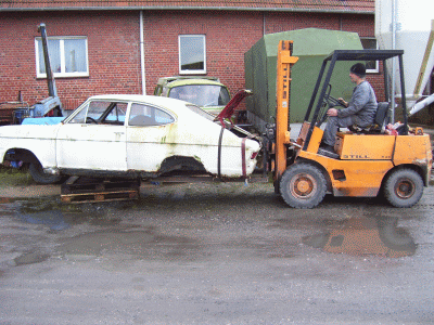 So ein Gabesstapler ist echt ein feines Ding wenn man ein Auto ohne Achsen aus der Werkstatt kriegen will kiff .