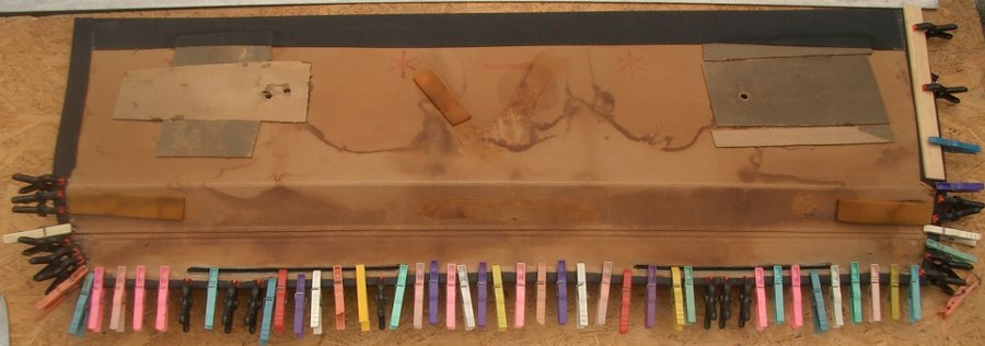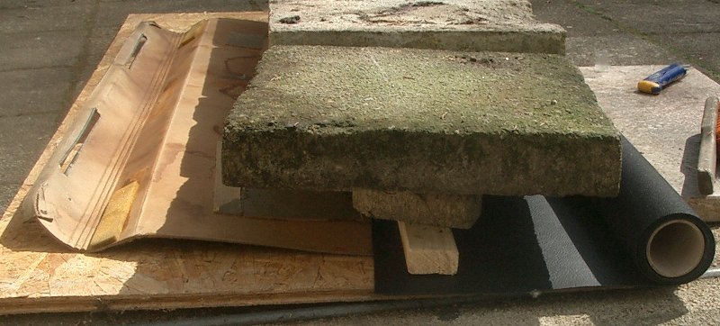 Dabei hatte ich als Unterlage eine Arbeitsplatte und von oben jeweils Holzplatten mit 3 Betonplatten (Gehwegplatten) als Gewicht.