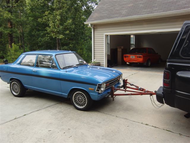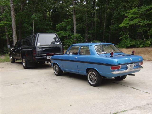 Ich habe meinen 79er Kadett C vor 2 Wochen von Georgia nach Carlisle, Pennsylvania, gefahren, und wollte auch meine 71er Limo nicht zuhause lassen. Da der gute "Mini Brute" allerdings eine 3,89er Hinterachse hat wollte ich meinem Freund nicht zumuten dass er ihn auch unter eigener Kraft die 760 Meilen (1.220km) nach Carlisle faehrt. Ich habe schon frueher eine Anhaengevorrichtung gebaut, und damit haben wir den Kadett hinter meinem Pick-Up hergezogen. Die Vorrichtung ist an den originalen Schraubloechern der vorderen Stossstange angeschraubt, und der Rest besteht aus einer alten U-Haul Anhaengevorrichtung (20$ auf Evil-Bay) und den daran angeschraubten Gegenstuecken der Stossstangenhalter. Ich habe damit jetzt und schon vor 2 Jahren insgesamt runde 3.800km ohne die geringsten Probleme zurueckgelegt.
