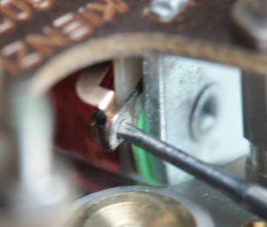 Diese Sicherung ist eine Feder aus (glaube ich) Bronze (kupferfarben) und mit einem Gegenstück an der Spule verlötet.