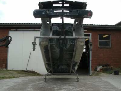 Der Wagen ist nun komplett nackt und auf ein Gestell gesetzt.