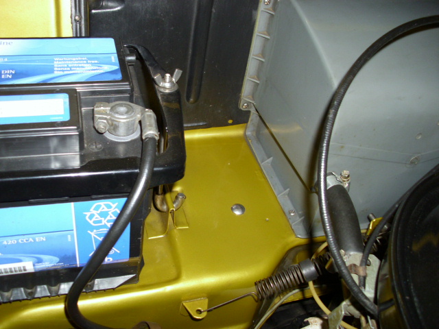 Grundsätzlich bohre ich auch sehr ungern Löcher nachträglich irgendwo rein, ich bin aber mal davon ausgegangen das es auch orginal so gewesen ist, das ich mich doch dazu entschlossen habe 1 Loch zu bohren, auf der Fahrerseite hat sich das erübrigt, da konnte ich der Schwerkraft mit einem Kabelbinder ein Schnippchen schlagen, ansonsten finde ich, das es der Optik nicht ganz so schlimm schadet neben der Batterie, ist übrigens ne' Schloßschraube, wo ich dann von unten das Dämmteil mit einer Flügelmutter inklusive Unterlegscheibe abgefangen habe.