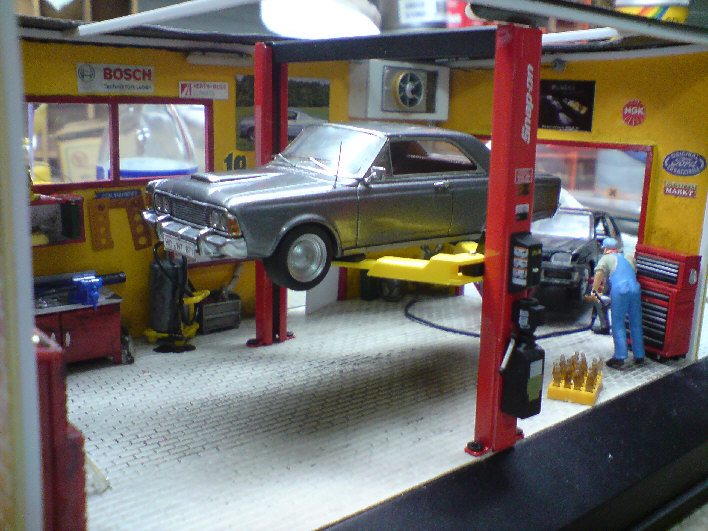 muß auch noch dazu sagen,daß ich das Werkstatt Dioram für meinen Chef gebaut hab...das bekommt er zum 50sten Geburtstag...der ist Ford Fan....er hatte mal einen heißgemachten P7b...und der kommt da auf die Bühne....