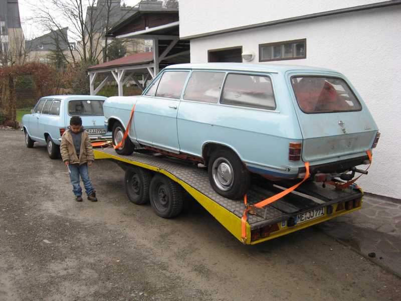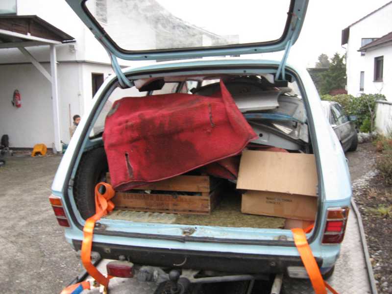 Heute haben wir meinen Neuzugang aus Niedersachsen importiert, natürlich einen schlüpferblauen Kombi. Das Gespann fuhr sich ungewohnt instabil. Nach dem Abkuppeln wusste ich warum. Wir hatten den Kofferraum der Berta auf dem Hänger so mit Teilen beladen, dass der Hänger nach dem Lösen sofort vorne hoch ging, eine negative Stützlast sozusagen.