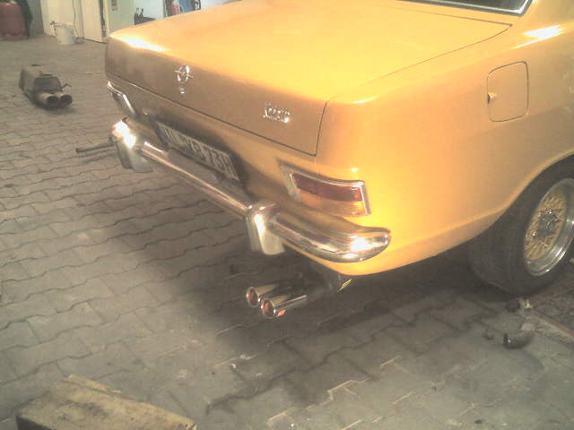 Hängt eigentlich schön satt in den Original Gummis. Das Problem ist nur, das der Endschalldämpfer kein Platz unter dem Kadett-Heck hat. der Ist einfach zu groß. Das sieht aus, als würde er frei unten rumhängen. Muss ich mal gucken, was ich da mach.