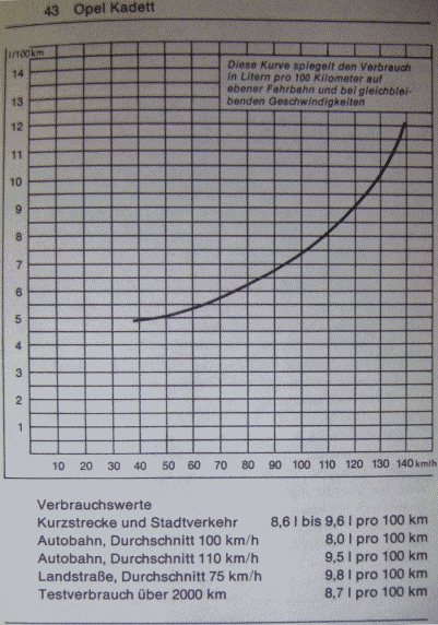 hallo!ich fahre meinen 45ps-kadett unter acht liter-das letzte mal,als ich nachgerechnet habe(fahrt zum jahrestreffen)lag ich bei 7,4 liter-incl autobahnfahrt.viele grüsse!