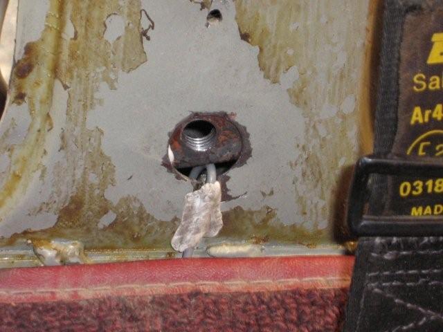 Das untere Gewinde sitzt dabei im Schweller hinterm Teppich. Haben sie denn wenigstens oben in der Säule das Gewinde gefunden? Und im Tunnel? Und wie ist das auf der rechten Seite gelöst?