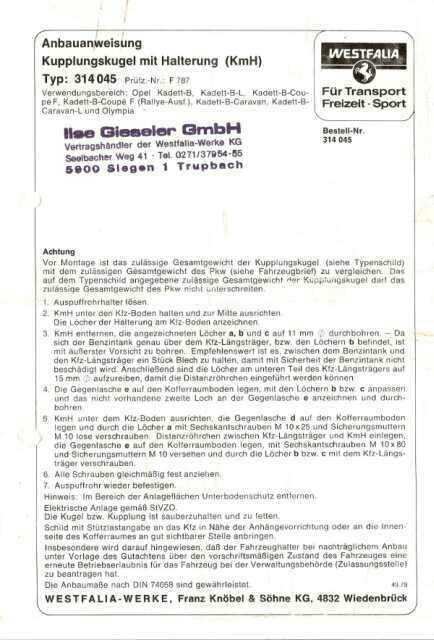 Also mit der Grundeinstellung eine AHK an den Kadett bauen und dann mit den passenden Papieren zum Eintragen zum TÜV fahren, bin ich auch an die Sache herran gegangen. Ist ja schließlich eine Veränderung am Wagen.