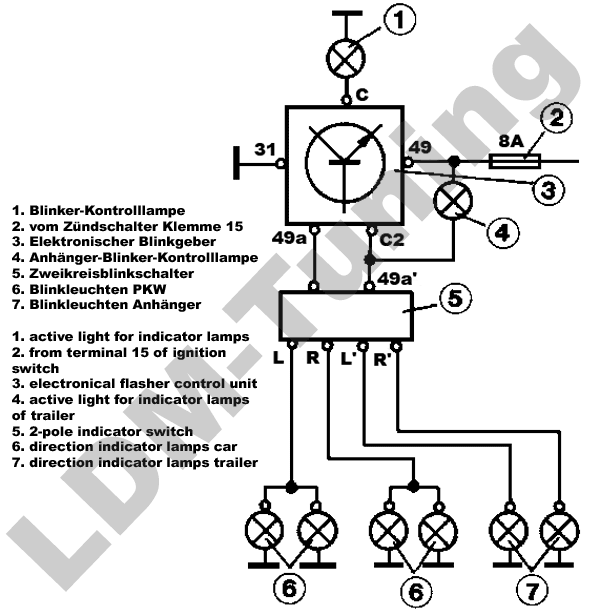 wie schon gesagt du brauchst ein relais mit 4 anschlüssen. 49, 49a, 31 und c2. vom alten relais die kabel ab und genau gleich an das neue dran. eine neue leitung an c2 und auf die kontrolleuchte. den zweiten anschluß von der leuchte auf masse, irgendwo an der karosse.