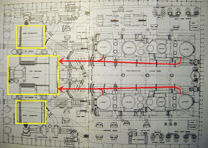 zwei Vierzylindermotoren und mit dem Abdampf wurde die Turbine der mittleren Schraube welche nur für die Fahrt vorwärts funktionierte angetrieben.