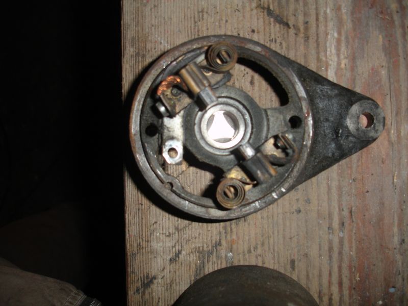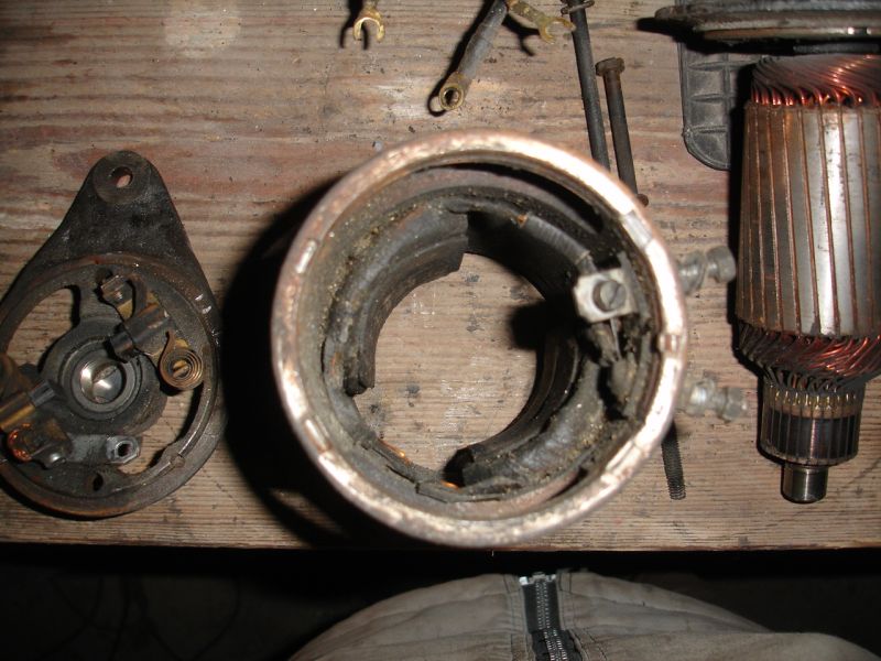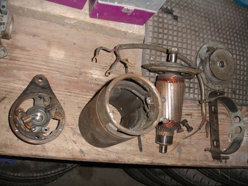 Im ersten Bild li. auf der Trägerplatte siehst du die Bürsten oder auch Kohlen genannt. Die vierkantigen Teile die mit Federn auf den Kollektor(das mit Längslamellen am Ende des Ankers befindliche Teil) gedrückt wird. Die würde ich erneuern.