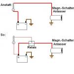 Ich glaube was er sagen will ist das er mit dem Zündsignal vom Zündschloss nur die "Schleuse" aufmacht. Sprich das Relais wird über das Signal vom Zündschloss geschaltet also gesteuert, der Strom für den Magnetschalter kommt aber über das Relais direkt von der Batterie! Du legst mit dem Zündsignal sozusagen nur den "Schalter" für den Strom von der Batterie zum Magnetschalter um. War das verständlich? Schwer zu erklären.